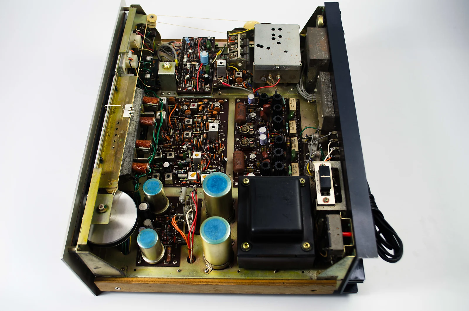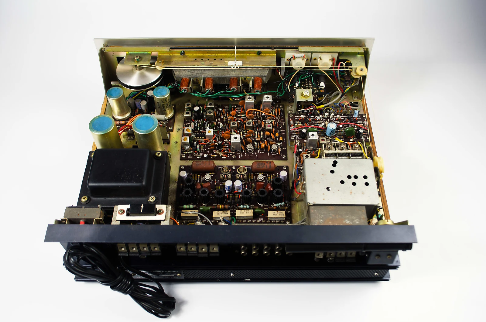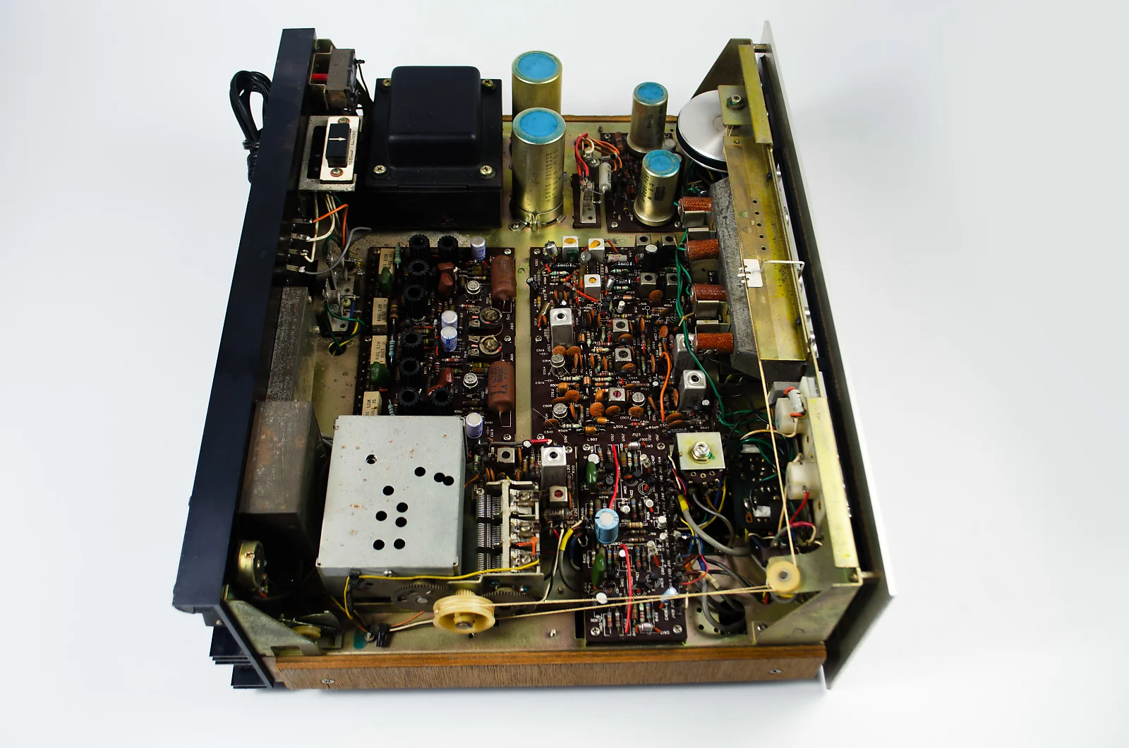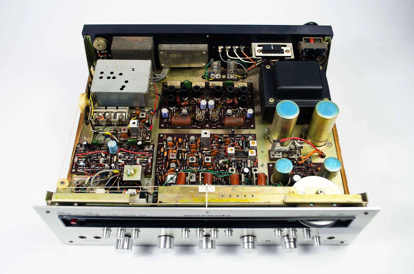 Upon inspection, the unit had scratchy controls, a dim dial, and some distortion in one channel. Therefore, it underwent servicing by our technician. Manufacturer used certain transistors in this model that are known to fail after 40 years, so all of these were replaced. This upgrade resolved the distortion issue. Additionally, several questionable capacitors were replaced.
